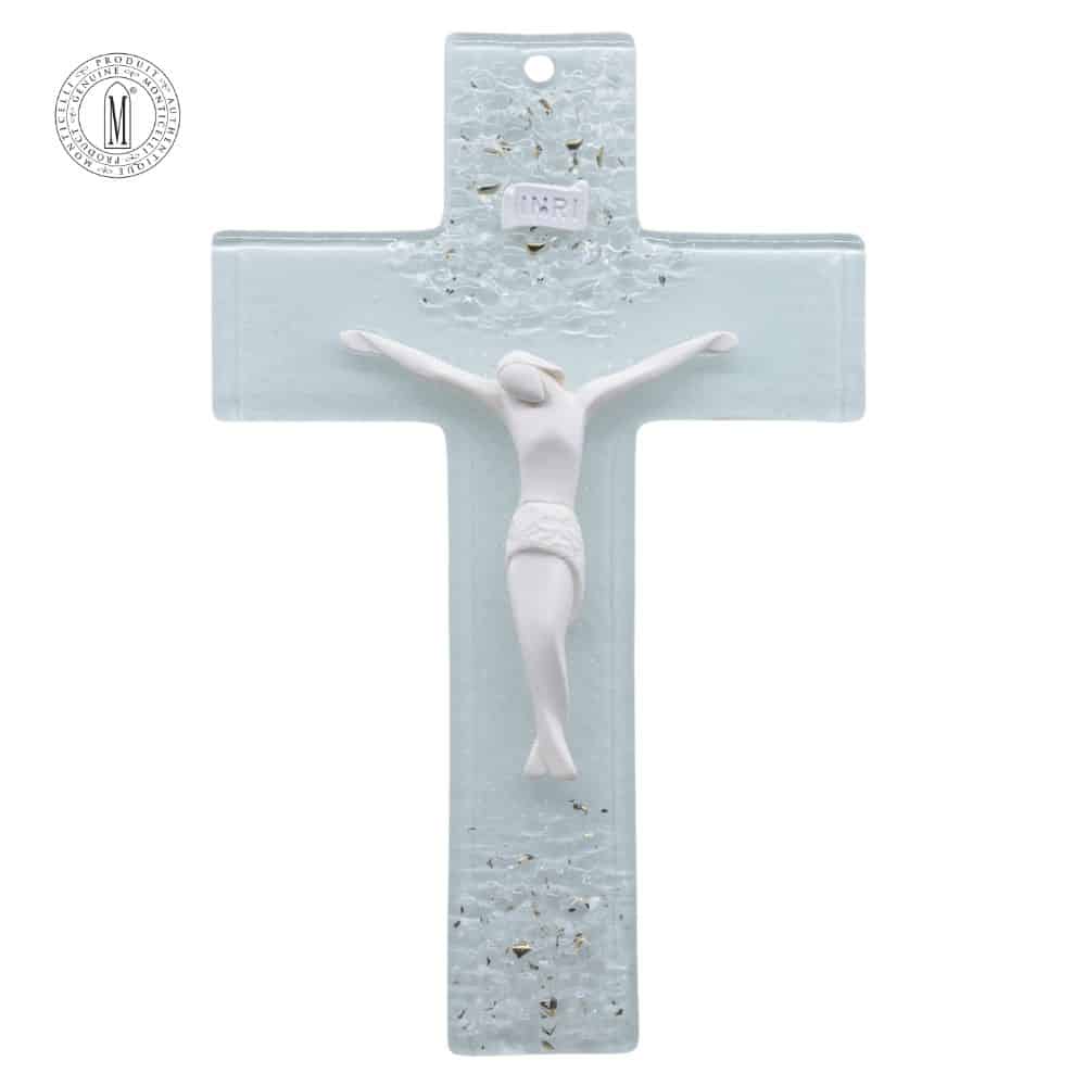 The white corpus is finely detailed and securely mounted, creating an elegant contrast against the glass cross while preserving a classic Catholic aesthetic. The combination of Murano glass and metal components results in a wall crucifix that is visually refined, structurally sound, and suitable for long-term display.