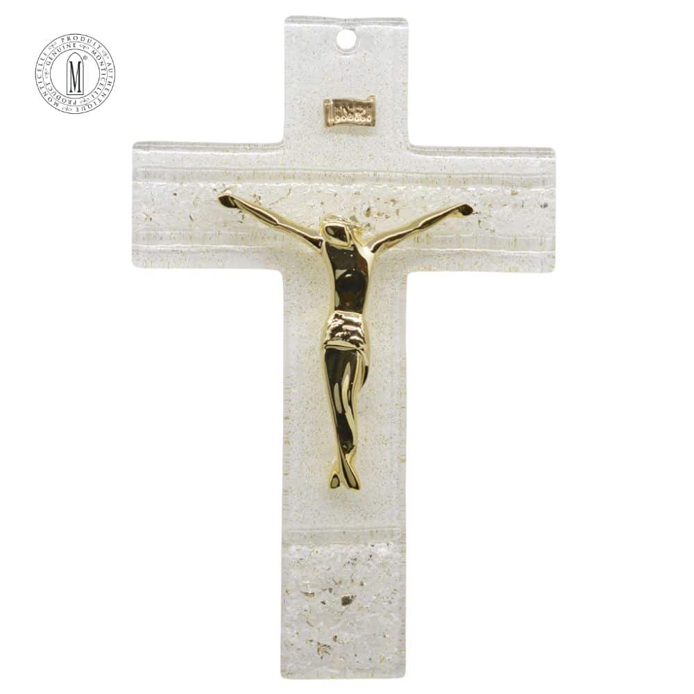 The gold-tone metal corpus is finely detailed and securely mounted, creating an elegant contrast against the glass cross while preserving a classic Catholic aesthetic. The combination of Murano glass and metal components results in a wall crucifix that is visually refined, structurally sound, and suitable for long-term display.