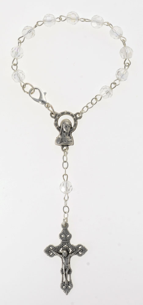 Decade rosary in fire-polished crystal with Aurora Borealis and clasp. Color clear – Bead Size 6mm – 15/64″ – Length 15cm – 5 3/4″ – Code RD138A-15L – Minimum purchase 4 pcs. – Made in Italy.