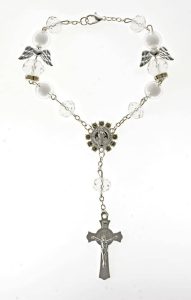 Decade rosary with Angel pendent in fire-polished crystal with clasp. Gold plated – Color clear – Bead Size 12mm – 0.45″ – Length 20cm – 8″ – Code RDH8011G – Minimum purchase 4 pcs.