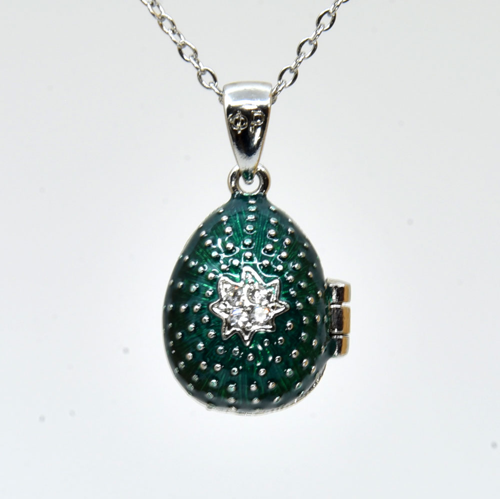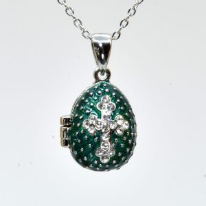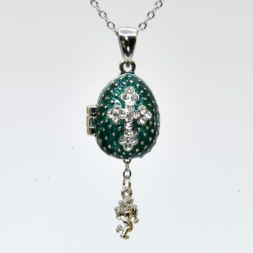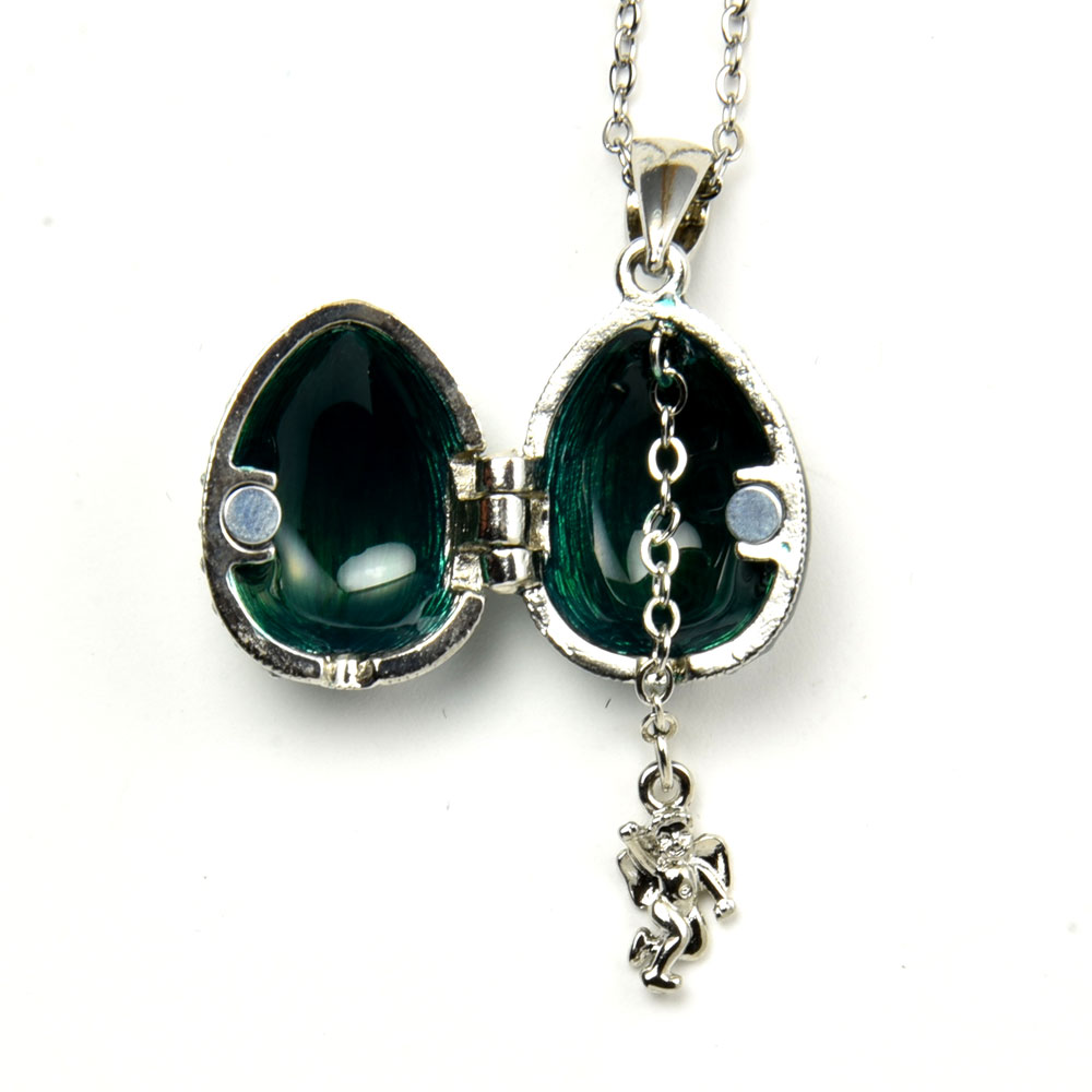 Emerald mini locket egg pendant with Guardian angel charm + chain – size20mm x 14.7mm / .78″ x .57″ – Gift boxed Code: LFA-17 – Made in Italy