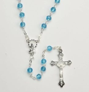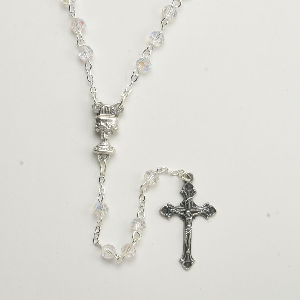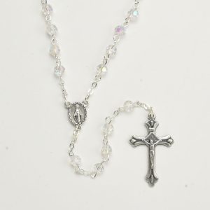 FIRST COMMUNION Fire polished crystal rosary with Aurora Borealis – Color Clear Crystal – Size beads 5mm – 0.19″ – Length 42cm – 16½” – Code RCT364AC-15 – minimum purchase 4 pcs. Made in Italy