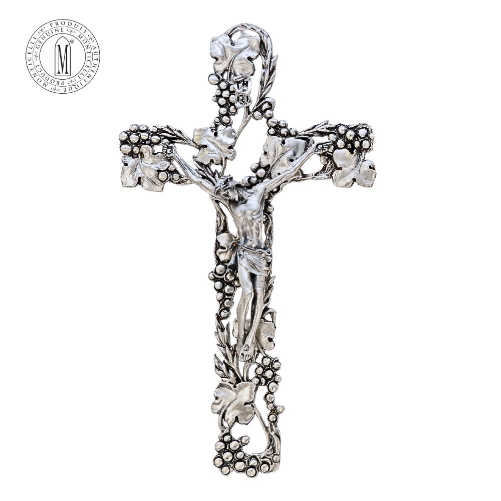 The C647-24 S300AG Solid Pewter Crucifix stands as a stunning work of sacred art, uniting symbolism, faith, and fine Italian metalwork. Measuring 23.5 cm (9¼”), this crucifix features a delicate grape and vine motif, symbolizing the Eucharist and Christ’s words: “I am the vine, you are the branches.” Each detail, from the flowing vines to the sculpted corpus of Christ, is cast in solid pewter and finished with a hand-brushed silver plating that gives it a timeless, reverent sheen.