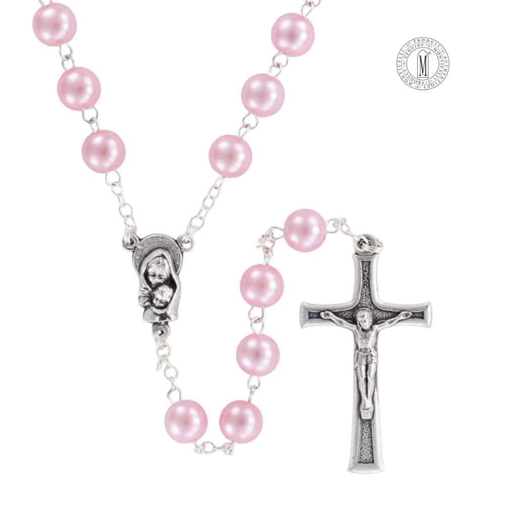 Elegant Premium Imitation Pearl Rosary RN7-6 Pink Beads, Silver-Plated Crucifix, Made in Italy