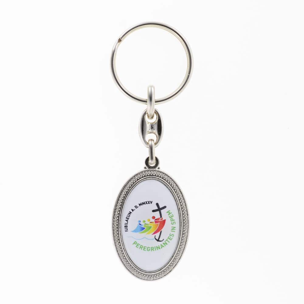 Celebrate the Jubilee Year with this beautiful Jubilee 2025 keychain (KEO-JUB), made in Italy and designed to commemorate the spiritual journey of pilgrims and faithful worldwide. Measuring 85 mm (3 11/32″) in length, this elegant keyring features the official logo of the Jubilee 2025: “Peregrinantes in Spem” (“Pilgrims of Hope”).