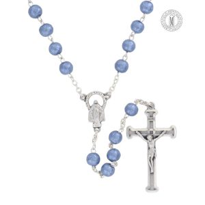 The Aqua Rosary RN132-7 is crafted with 6mm hammered moonstone-style beads, offering a luminous and elegant devotional design. Measuring 47 cm (18½”), it includes a finely detailed crucifix, centerpiece, and durable silver-plated chain, ensuring both beauty and lasting quality.