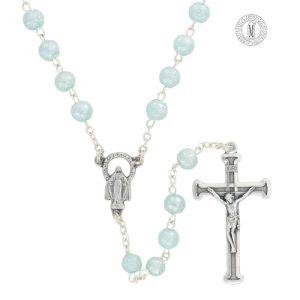 The Cobalt Rosary RN132-8 is crafted with 6mm hammered moonstone-style beads, offering a luminous and elegant devotional design. Measuring 47 cm (18½”), it includes a finely detailed crucifix, centerpiece, and durable silver-plated chain, ensuring both beauty and lasting quality.